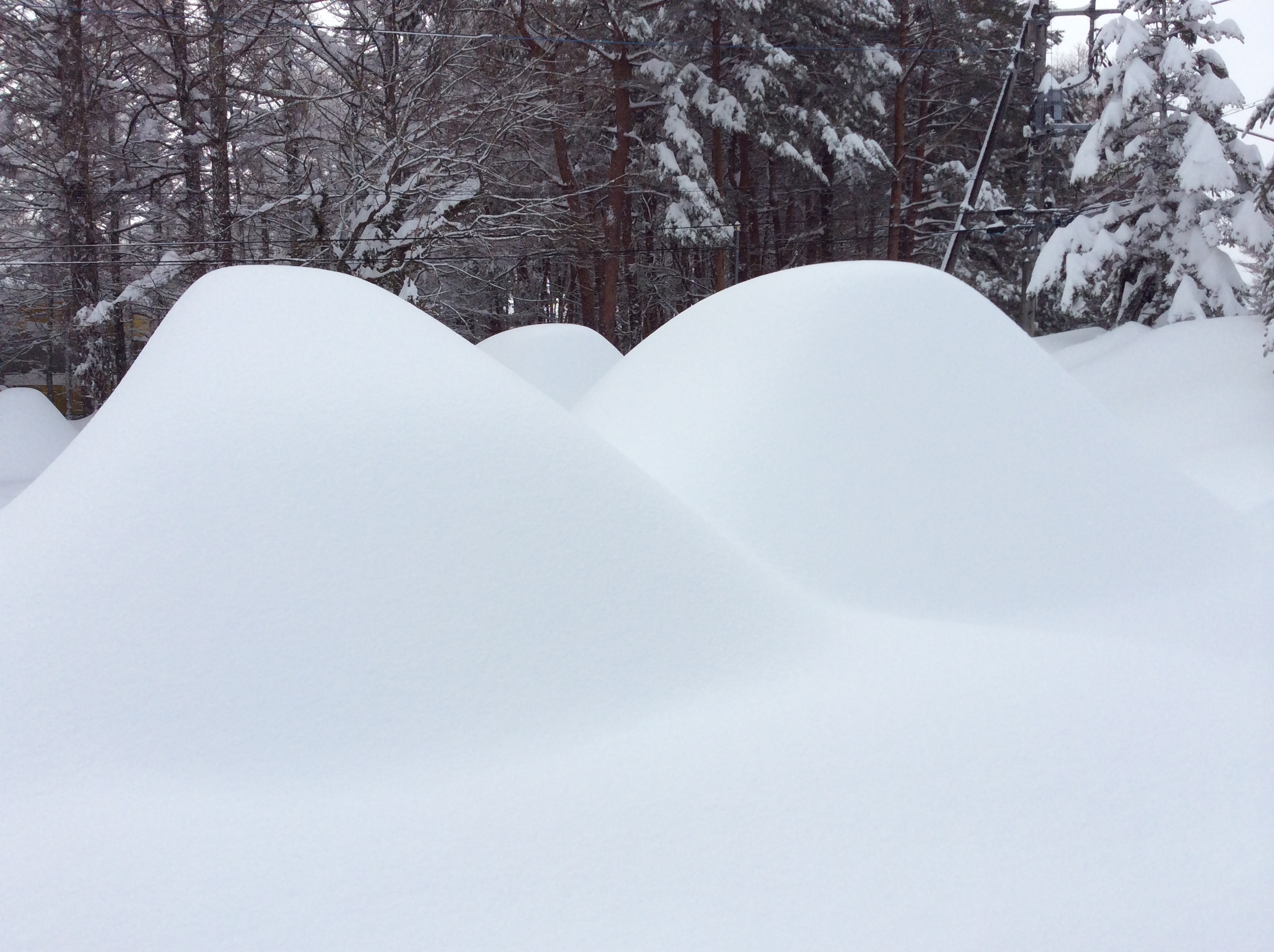 先週末に降った雪をかいてできた雪山の上にさらに降り積もるので、周囲が異様な光景になる。